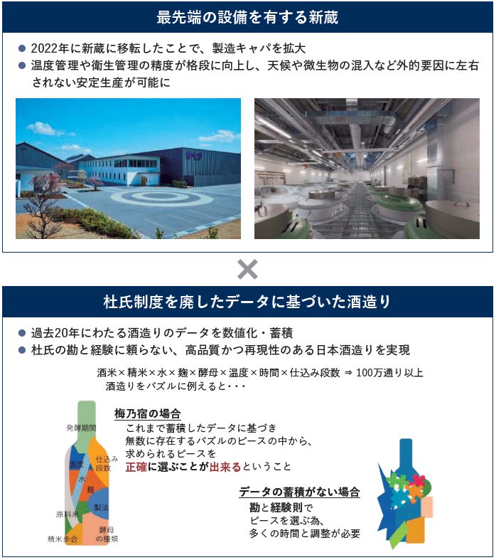 梅乃宿酒造は杜氏制度からデータを活用した酒造りに転換し、同一商品の味の再現制度の工場や品質の安定化を実現させています。