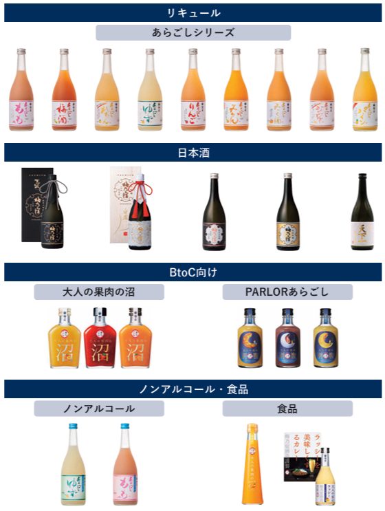 梅乃宿酒造は、日本酒リキュール及び日本酒等の定番商品やジン等のスピリッツを製造して国内外に販売するほか、酒粕、ドレッシング等の発行をテーマとした食品を販売しています。