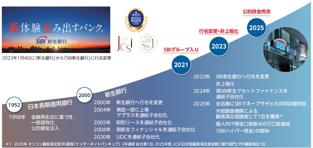 SBI新生銀行の前身は1998年に経営破綻した日本長期信用銀行(長銀)であり、2000年には「新生銀行」として再生して2004年に再上場しており、2021年にはSBIグループの連結子会社となって2023年にTOBで上場廃止となっています。また、2025年7月には公的資金を完済しています。
