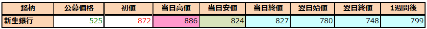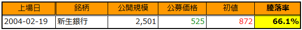 また、SBIに買われる前の新生銀行は2004年東証一部に上場しており(2023年上場廃止)、初値は大幅高となりました。