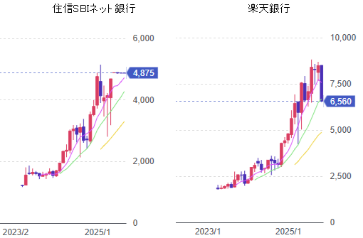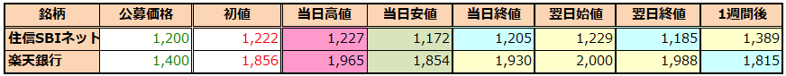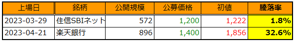 また、上場後は両銘柄とも大きく上昇しており、住信は公募比で一時4倍超、楽天は6倍超までありました。