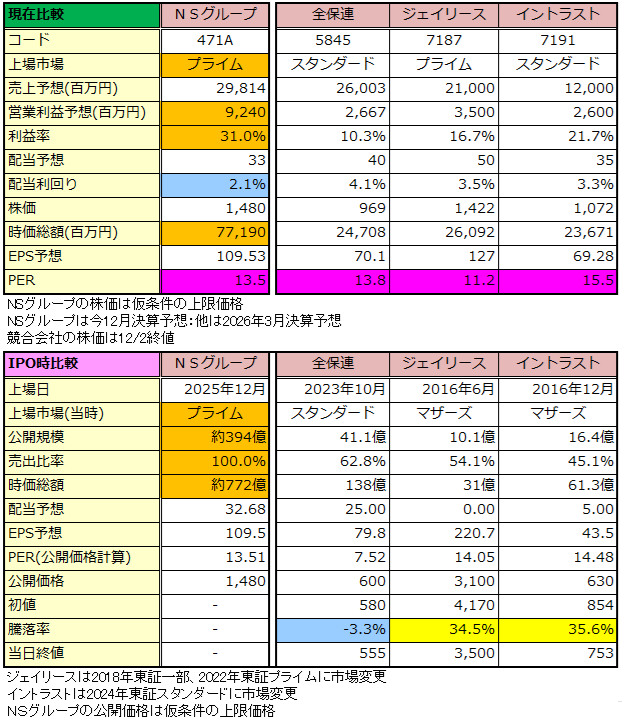 NSグループに対する事前評価は微妙なところで、ブックビルディング期間は12/2(火)から12//5(金)となってます。
