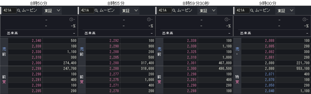 9時直前の初値合致点は2,300円前後で、9時には約2.5倍の買い越しでスタートしています。