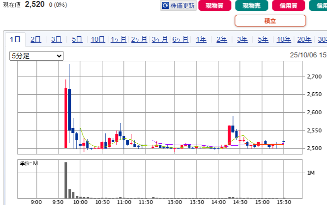 初値形成後も上昇して2分後の9時45分には2,735円の高値を付けましたが、その後は下落して安値は2,491円までありました。その後少し戻す場面もありましたが戻しきれず、最後は初値よりは上ですがVWAPは上回れず@2,520円で引けています。
