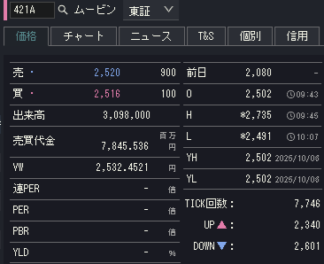 ムービン・ストラテジック・キャリア(421A)は9時43分に2,503円の初値を付け、初値形成時の出来高は101.02万株で売買代金は約25.3億円でした。