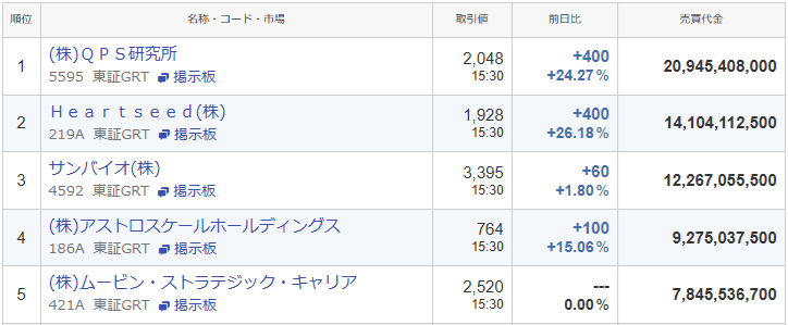 売買代金は東証グロース市場で5位、全市場では169位でした。