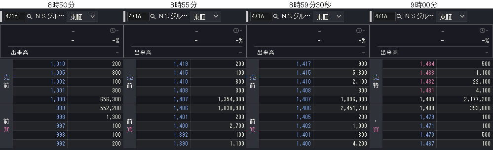 全部で346.94万株あった買い支えの玉は、8時52分に100万株、8時55分で150万株、9時直前で200万株の投入でした。