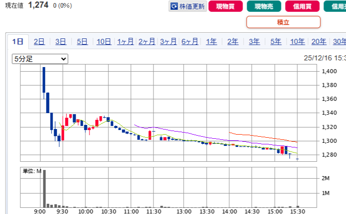 シンジケートカバー玉で何とか初値は付けたものの、買い手不在でそのまま下落。1,300円を割ったところで一度反発しましたが、上値は多く失速してしまいました。後場も良いところなしでズルズルと下落し、最後は1,274円の安値引けです。