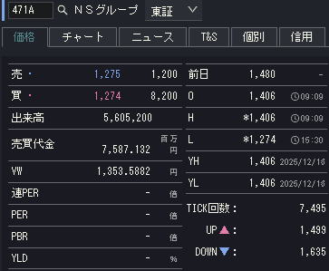 NSグループは9時9分に1,406円の初値を付け、初値形成時の出来高は250.88万株、売買代金は約35.3億円でした。