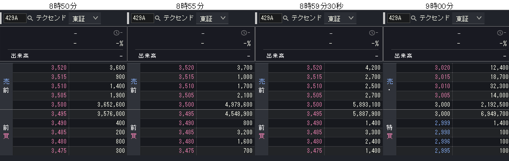 9時直前の初値合致点は3,500円前後で、9時には3倍強の買い越しでスタートしました。