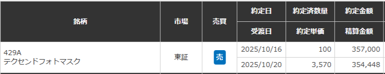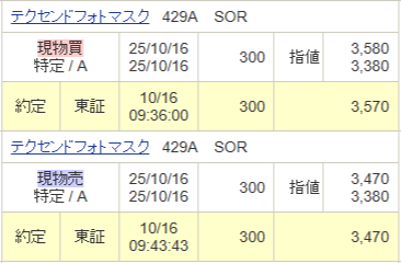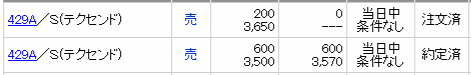 ネット当選分の400株(家族含)と店頭分の600株は3,500円の指値で売り注文を出していたので@3,570円の初値売りとなりました。店頭分の残200株は指値に10円届かず売れていません…。