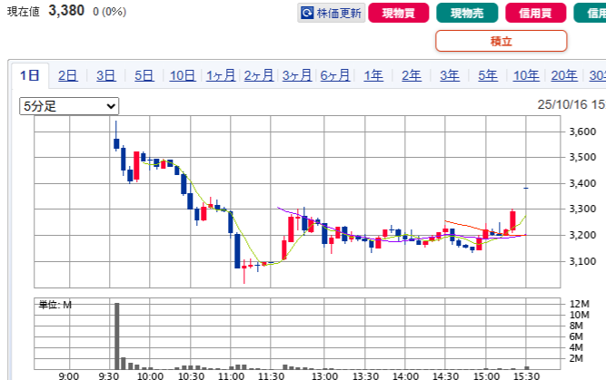 後場には少し戻しましたが上値は重く、しばらく3,200円近辺でもみ合う格好となり、最後は跳ねて後場高値の3,380円で引けています。