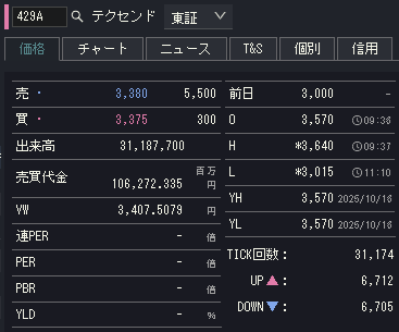 テクセンドフォトマスクの最終的な出来高は、公開株数の52,203,500株に対して31,187,700株(約0.6回転)、売買金額は約1,062.7億円で、VWAPは約@3,407.5円でした。