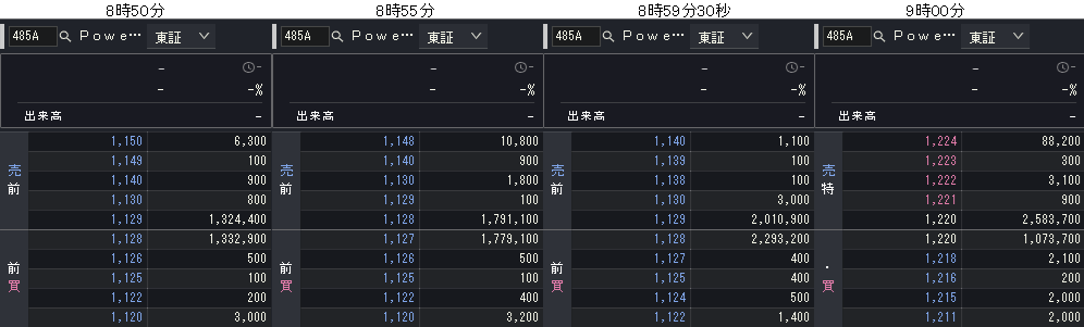 以降は8時50分で80万株、ここでようやく支える形となり、54分で100万株、55分で110万株となり、57分で全玉の投入を終えたと思われます。