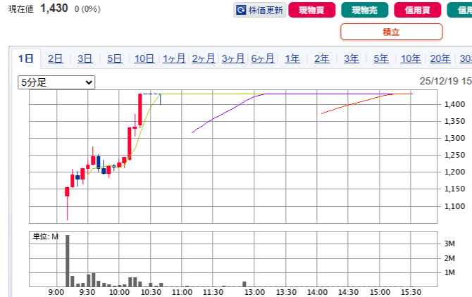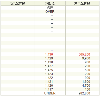 その後に初値を奪還すると、公開価格の1,200円を挟んでもみ合う展開に。そして10時過ぎたあたりから急騰して一気にストップに張り付きました。その後何度か剥がれそうになりましたが、最後は50万株以上の買い注文を残して1,430円のストップ高で引けています。