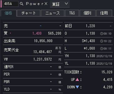 パワーエックスは9時10分に1,130円の初値を付け、初値形成時の出来高は227.14万株、売買代金は約25.7億円でした。