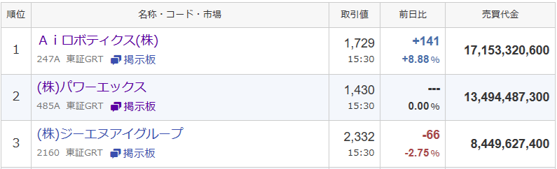売買代金はストップ高に張り付きながらも東証グロース市場で2位、全市場で115位でした。