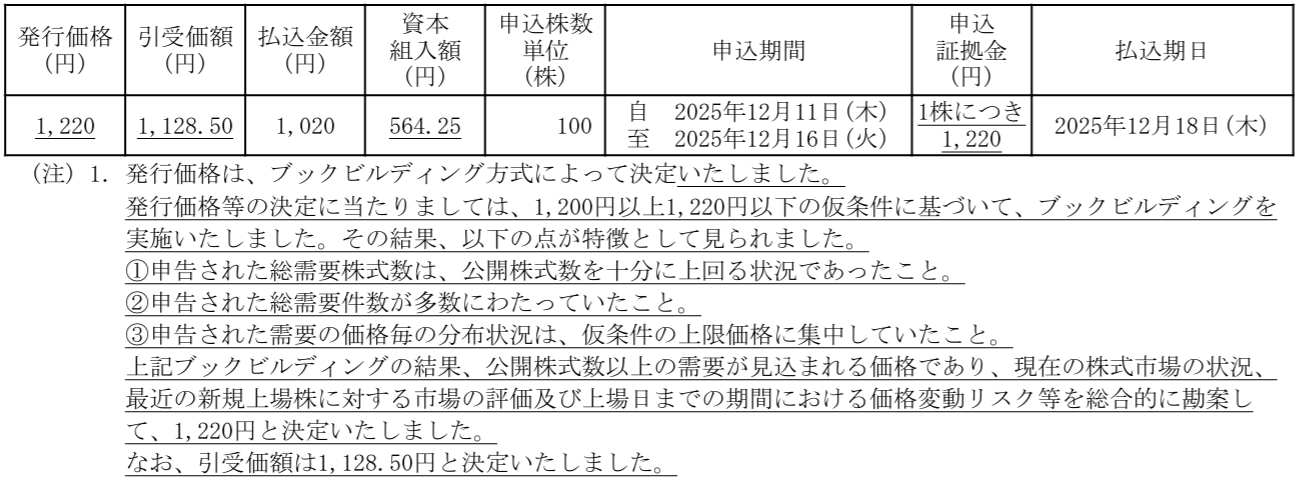 また、従業員持ち株会へ4.16万(下限価格で約0.5憶円)株を上限として親引けで割り当てる予定であったところ、最終的に4.09万株(約0.5憶円)の割当で決定しています。