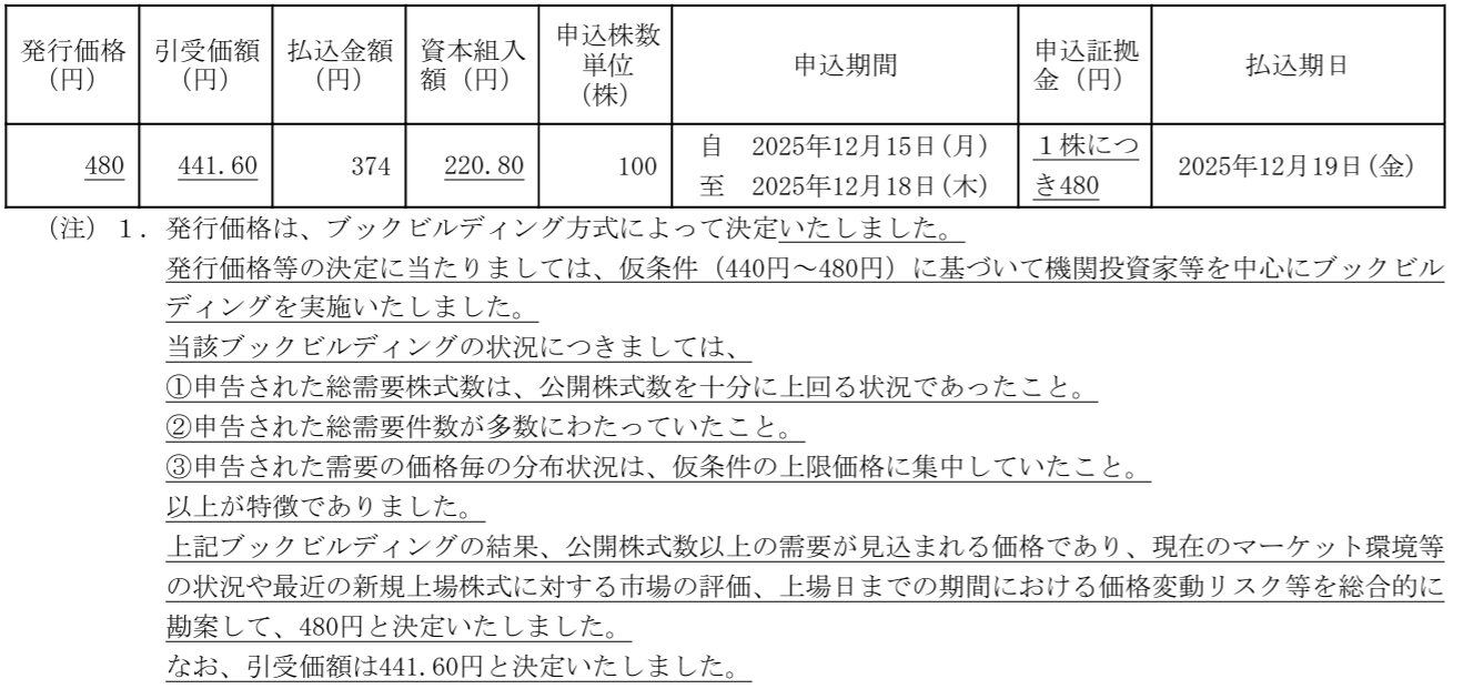 スタートラインIPOの公開価格は、仮条件440円~480円の上限価格となる480円で決定しました。