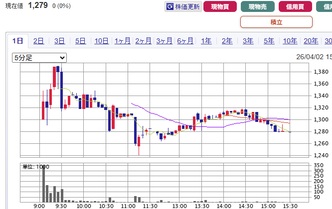 9時直前の初値合致点は1,260円に入ったシンジケートカバーに支えられていた格好で、9時には22万株の売り越し(買い玉の3.6倍程度)でスタートしました。